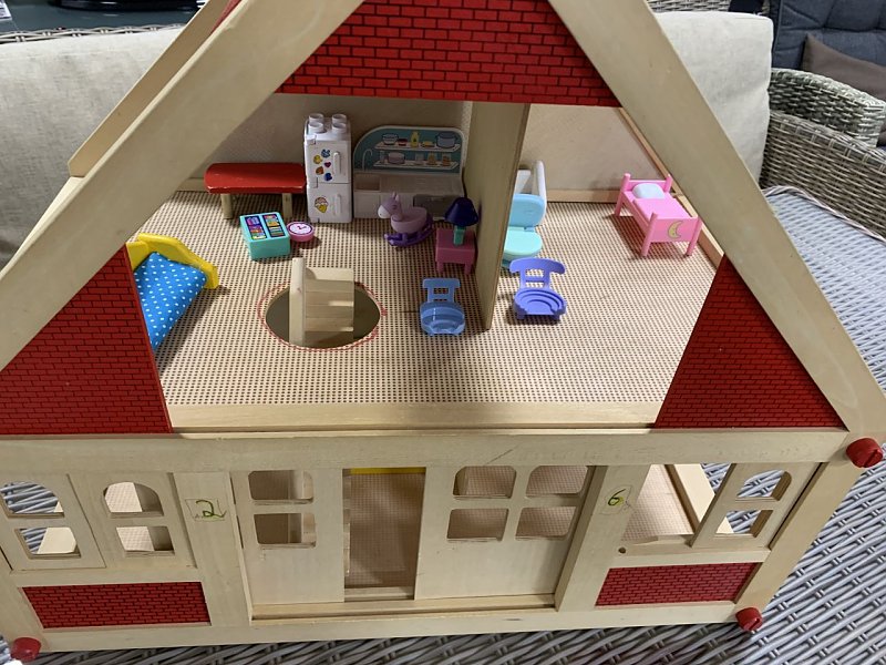 Puppenstube Puppenhaus mit ETWAS Zubehör in Top-Zustand. Dieses liebevoll gestaltete Puppenhaus verfügt über 4 Zimmer - Schlafzimmer, Wohnzimmer, Küche und Badezimmer - auf 2 Stockwerken. Es ist kaum bzw. sehr wenig möbliert und eignet sich ideal für Kinder ab 2 Jahr. Das Set besteht aus Holz. Mit den Maßen H 58cm x B 63cm x T 36cm bietet dieses Puppenhaus stundenlangen Spielspaß für die Kleinen.