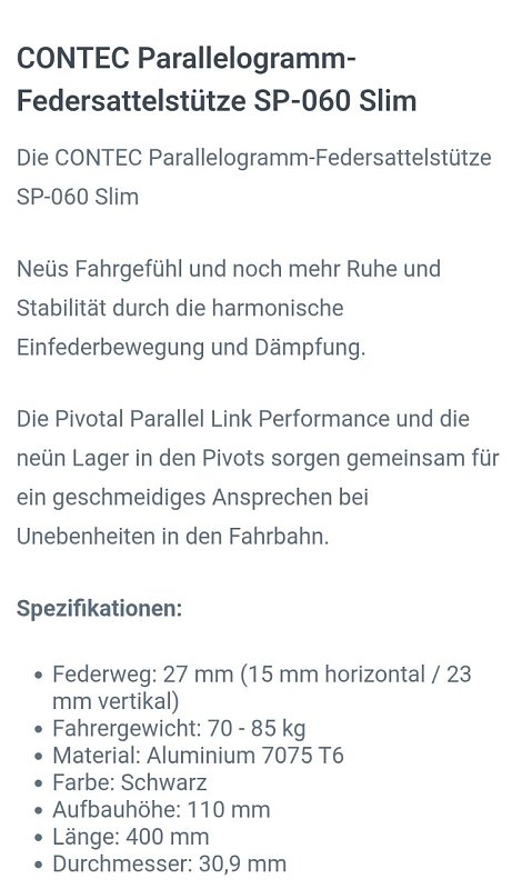 Verkaufe Contec Parallelogramm Sattelstütze gefedert..Durchmesser 30.9mm..Preis 25€