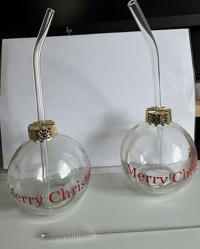Ich biete 2 Glühweingläser in Kugelfom mit passenden Trinkröhrchen aus Glas an. Dazu gehört noch eine Reinigungsbürste für die Röhrchen. Der Durchmesser ist ca. 9,5 cm und angegeben sind 400 ml Fassungsvermögen.