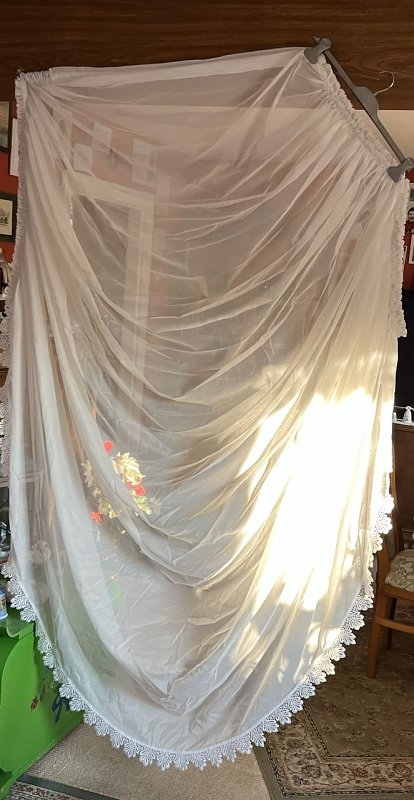 Seitenschals ca. 128 cm breit – aufgereiht und ca. 240 cm lang, die Seitenbänder sind je 164 cm lang