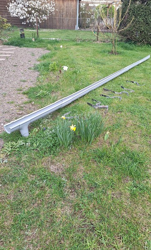 Biete: Regenrinne neu RG 80, 4,84 m lang, mit Dachrinnenhaken und Abfluss