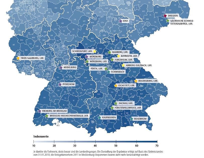 Ein echter Überraschungssieger des Deutschen Lernatlas ist Jena: Trotz nicht so guter wirtschaftlicher Rahmenbedingungen gehört Jena zu den besten Lernregionen und schneidet in allen untersuchten Teilbereichen sehr gut ab. Auch der Landkreis Sonneberg liegt in allen vier Lerndimensionen über dem Bundesschnitt. Das gute Abschneiden der thüringischen Vertreter belegt, dass bei den Lernbedingungen in Deutschland 20 Jahre nach der deutschen Einheit weniger ein Unterschied zwischen Ost und West, sondern vielmehr zwischen Süden und Norden besteht: Deutschlands Lernhauptstädte und beste Lernregionen liegen vor allem in Bayern, Baden-Württemberg und Sachsen.
