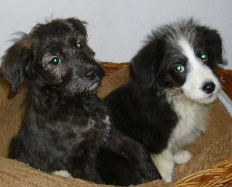 Die beiden Welpen sind rund12 Wochen alt, entwurmt und auch schon das erste Mal geimpft. Bonny ist eine braun/graue Hündin und Clyde ein schwarz weißer Rüde. Beide werden ungefähr mittelgroß und sind für alles offen. Stubenrein sind sie noch nicht richtig, aber ihre Ziehmutti Biggi hat ihnen schon einiges beigebracht.