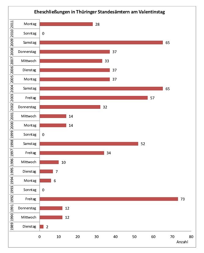 Nach Mitteilung des Thüringer Landesamtes für Statistik war das z. B. 1992, einem Freitag, mit 73 Eheschließungen der Fall oder im Jahr 2003, ebenfalls an einem Freitag, mit 57 Hochzeiten. In den Jahren 2004 und 2009 als der Valentinstag auf einen Samstag fiel, schlossen jeweils 65 Paare den Bund fürs Leben.