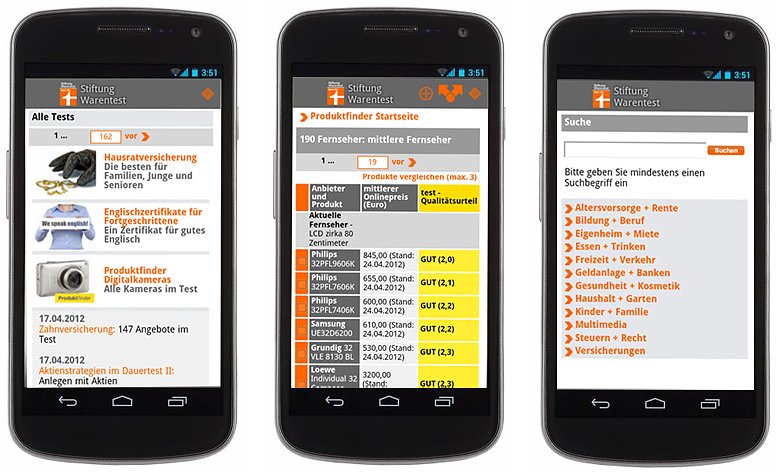 Aktuelle Verbrauchermeldungen und Testergebnisse der Stiftung Warentest können Sie jetzt auch unterwegs abrufen – mit unserer neuen test.de App für Android-Smartphones. Die kostenlose test.de App bietet Ihnen die neuesten Testergebnisse – ganz gleich, ob Sie eine neue Waschmaschine, einen Fernseher, Finanzprodukte oder Versicherungen suchen. Zusätzlich haben Sie Zugriff auf aktuelle Verbraucherinformationen. Test-Artikel können Sie bequem in der App erwerben und lesen und sich Tests und Artikel zusätzlich als PDF per E-Mail zusenden lassen.
