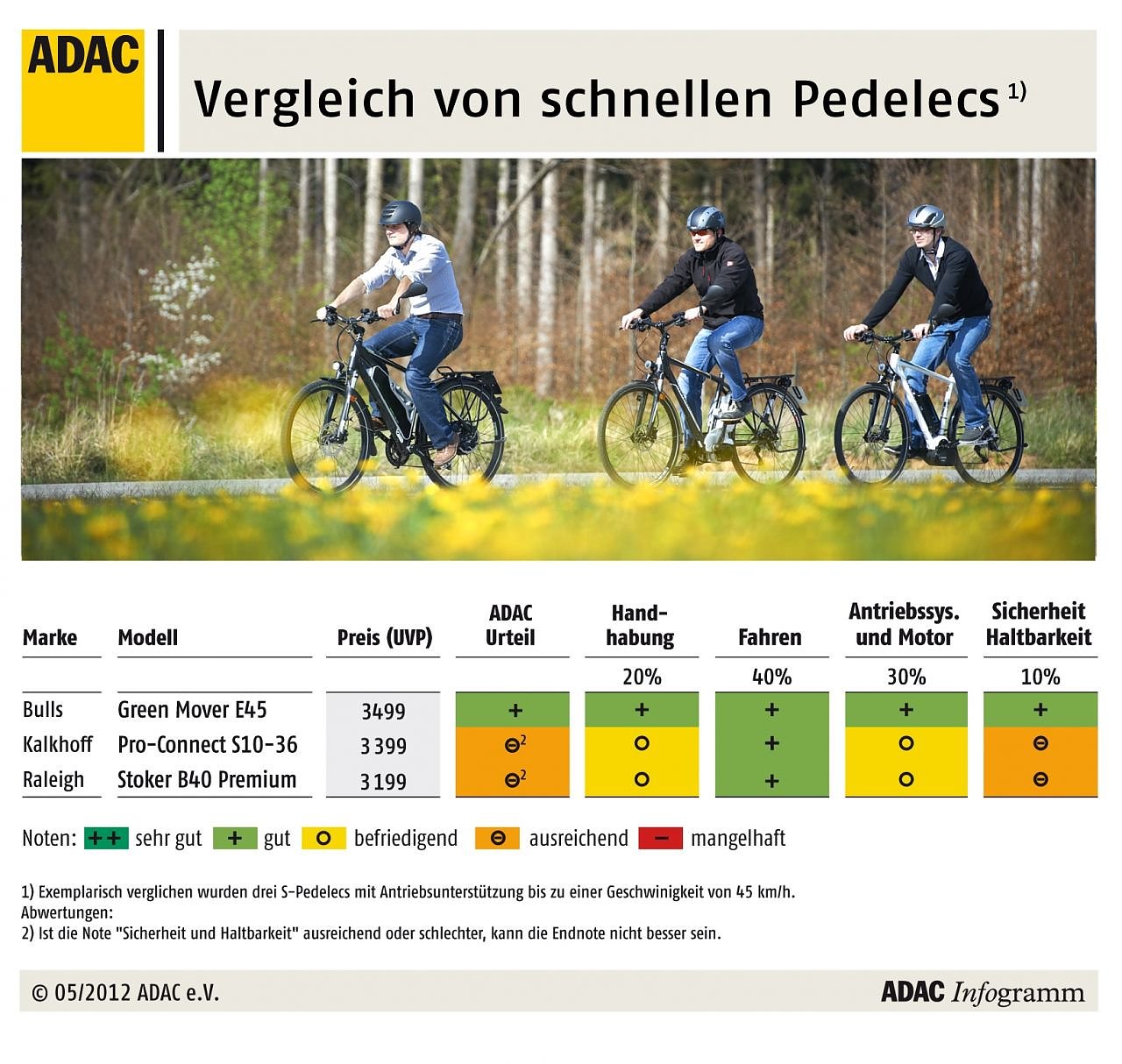 Geprüft hat der ADAC das Bulls Green Mover E45 (Hinterradnabenmotor), das Kalkhoff Pro-Connect S10-36 (Mittelmotor von Panasonic) und den Stoker B40 Premium von Raleigh (Mittelmotor von Bosch). Das teuerste Modell von Bull zeigte keine großen Schwächen und erreichte die Note gut. Die baugleichen Federgabeln der Modelle Kalkhoff und Raleigh hatten Probleme mit den höheren Anforderungen bei der Untersuchung, deshalb kamen die Räder nicht über ein ausreichend hinaus.
