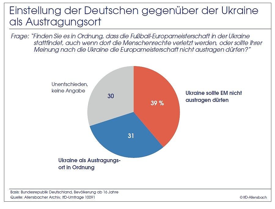 31 Prozent finden die Ukraine hingegen als Austragungsort in Ordnung, 30 Prozent sind in dieser Frage unentschieden. Auch die deutsche Mannschaft trägt ihre Vorrundenspiele in der Ukraine aus, das erste am 9. Juni in Lwiw (Lemberg) gegen Portugal. Dann wird sich zeigen, ob die Mannschaft von Bundestrainer Löw die in sie gesetzten hohen Erwartungen erfüllen kann.