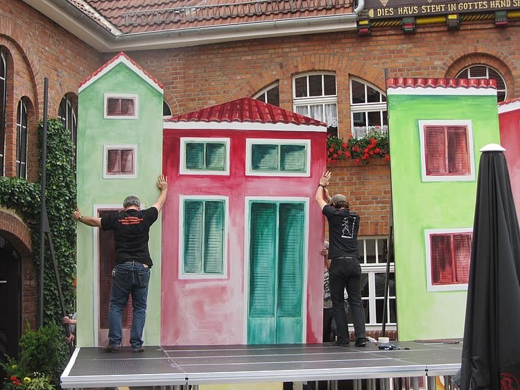 Autor: nnzAuch der Ex-Intendant packt mit an: Hubert Eckart (links) baut die Kulissen in der Traditionsbrennerei mit auf