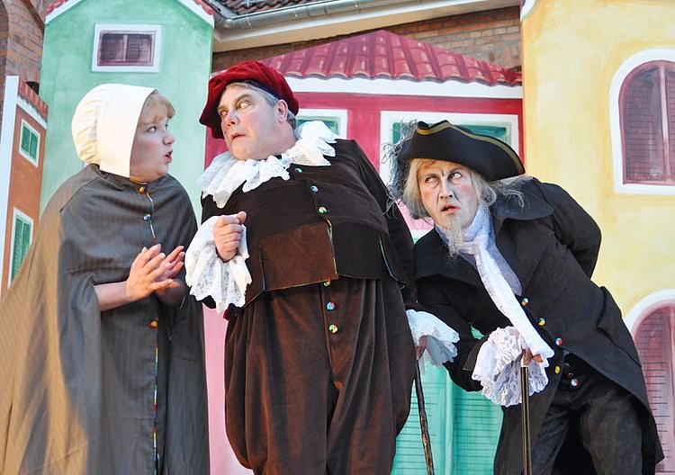 Die Amme (Katja Mitteldorf) bringt überraschende Neuigkeiten für die Herren Geronte (Fernando Blumenthal) und Argante (Klaus Heydenbluth)