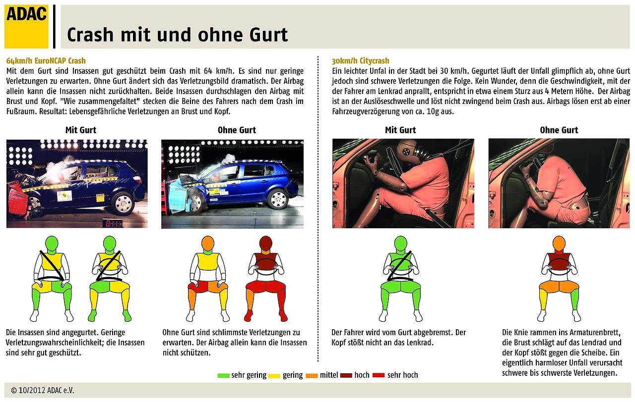 Sind Frontpassagiere angeschnallt, sind sie bei Tempo 64 in einem modernen Fahrzeug gut geschützt. Das ändert sich – trotz Airbag – aber dramatisch, wenn die Insassen ohne Gurt unterwegs sind. Lebensgefährliche Verletzungen an Brust und Kopf sind die Folge, dauerhafte Schädigungen der unteren Extremitäten sehr wahrscheinlich. Auch der Unfall in der Stadt mit 30 km/h läuft angegurtet glimpflich ab. Ohne Gurt sind auch hier schlimme Verletzungen zu erwarten. Ein derartiger Unfall entspricht für die beteiligten Personen immerhin einem Sturz aus vier Metern Höhe. Dass der Airbag bei derartig niedrigen Geschwindigkeiten nicht zwingend ausgelöst wird, macht die Situation noch prekärer.