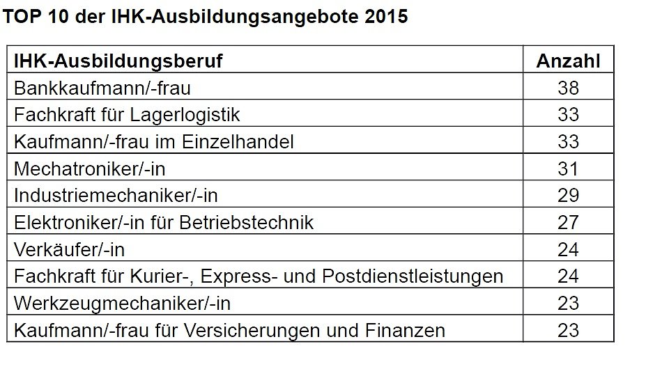 Vor allem Lehrlinge für industriell-technische Berufe werden aktuell gesucht. Allein 83 Mechaniker und Mechatroniker sowie 27 Elektroniker für Betriebstechnik stehen ganz oben auf der Liste und machen unter den Top 10 der Ausbildungsberufe knapp 40 Prozent der freien Lehrstellen aus, so der IHK-Chef.