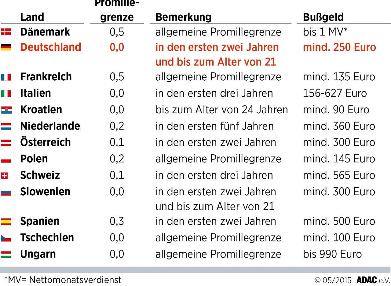 Bei einem Verstoß kann in Dänemark das Bußgeld schlimmstenfalls einen Nettomonatsverdienst betragen. In Tschechien ist generell kein Alkohol am Steuer erlaubt. Hier gelten für alle Autofahrer, egal welchen Alters, 0,0 Promille.