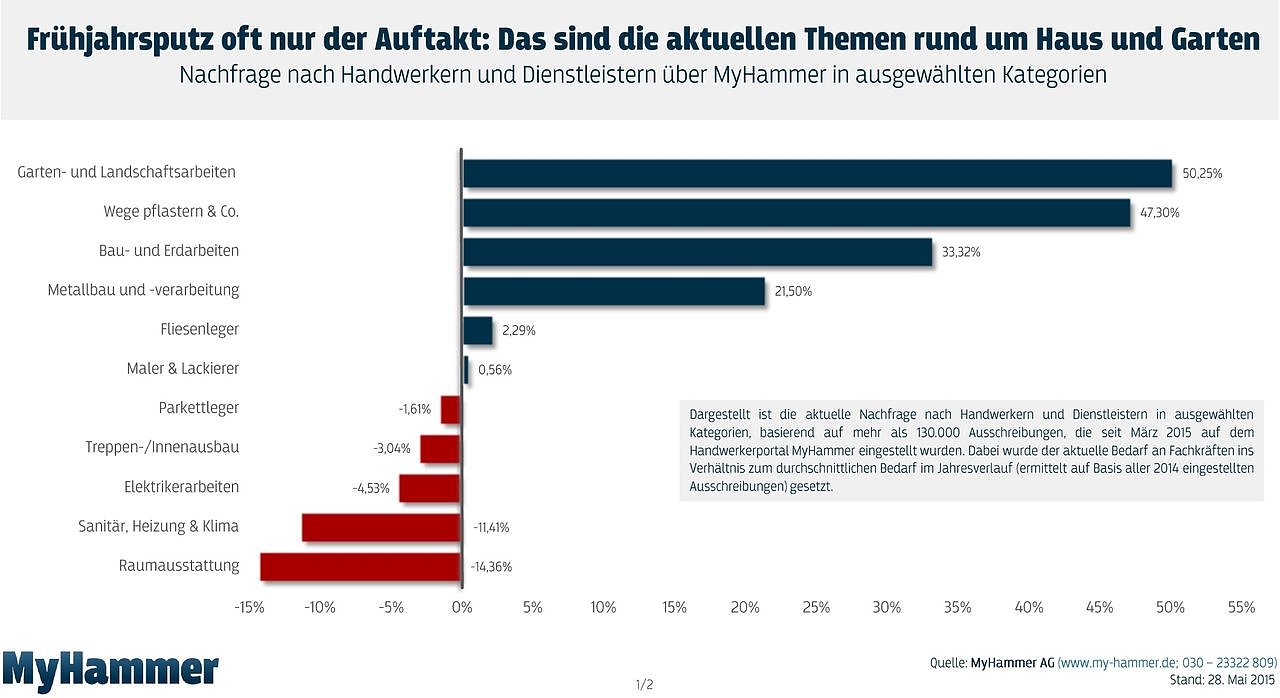 Ganz vorne bei den Frühlingsthemen liegen Garten- und Landschaftsarbeiten, erklärt Claudia Frese, Vorstandsvorsitzende der MyHammer AG. In diesem Bereich ist die Nachfrage nach professioneller Hilfe aktuell rund 50 Prozent höher als im Jahresdurchschnitt. Einen ähnlich großen Bedarf gibt es auch beim Pflastern von Wegen, Ein- und Auffahrten. Hier liegen die Ausschreibungen derzeit etwa 47 Prozent über dem Jahresmittel.