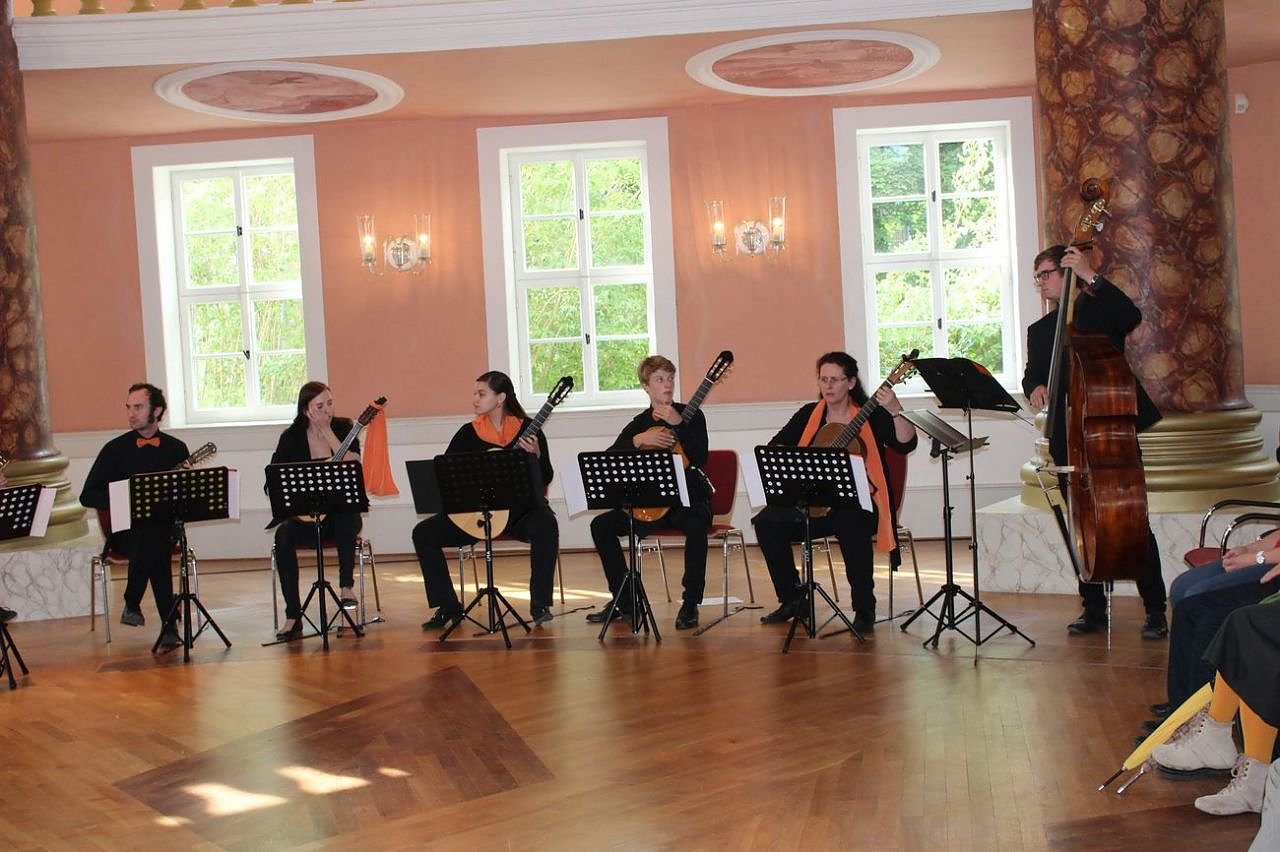 Sextett des Landesjugendzupforchesters Thüringen mit der zweiten Vorsitzenden des Landesmusikrates Daniela Heise.
