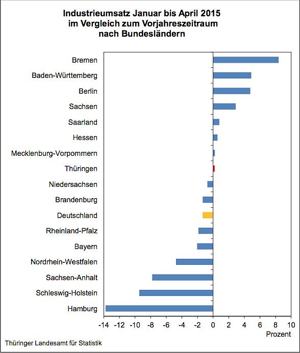 Industrieumsatz Januar bis April 2015 im Vergleich zum Vorjahreszeitraum nach Bundesländern (Foto: Thüringer Landesamt für Statistik)