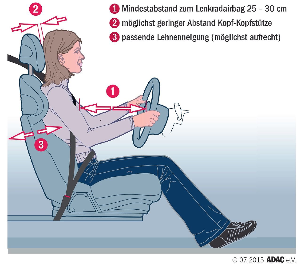 Um bei einem Heckaufprall gut geschützt zu sein, sollte die Kopfstütze so hoch wie möglich, maximal jedoch bis zur Kopfoberkante eingestellt sein. Das Lenkrad hat mit 25 bis 30 Zentimetern den perfekten Abstand zum Brustkorb.