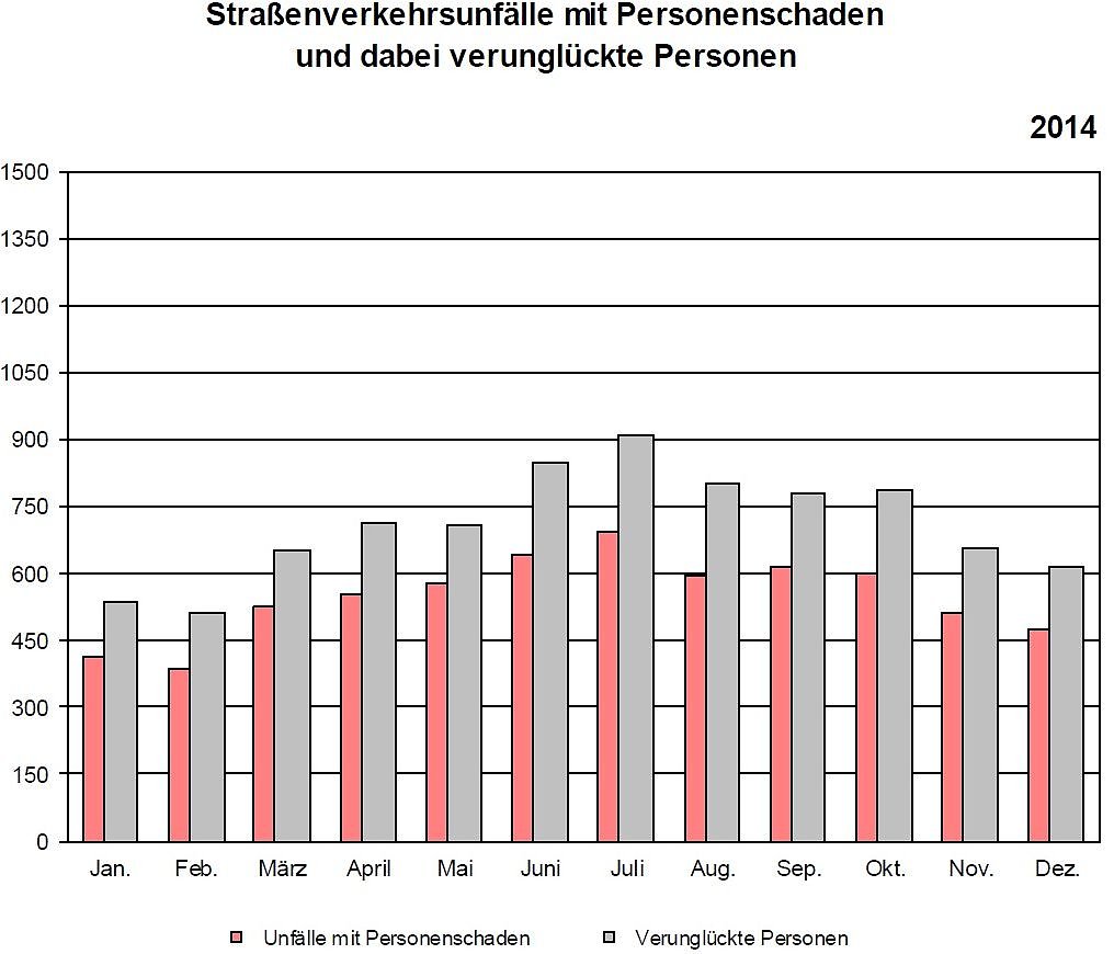 Die Zahl der Unfälle mit Personenschaden erhöhte sich im Mai gegenüber dem Vorjahresmonat von 575 auf 603 (+4,9 Prozent). Die Zahl der Unfälle mit Schwerverletzten stieg dabei von 148 auf 173 überdurchschnittlich an (+16,9 Prozent). Die Zahl der verunglückten Personen stieg im Mai 2015 gegenüber dem Vorjahresmonat von 708 auf 802 (+13,3 Prozent); wie im Vorjahr kamen im Monat Mai auf Thüringer Straßen 10 Personen durch Verkehrsunfälle ums Leben.