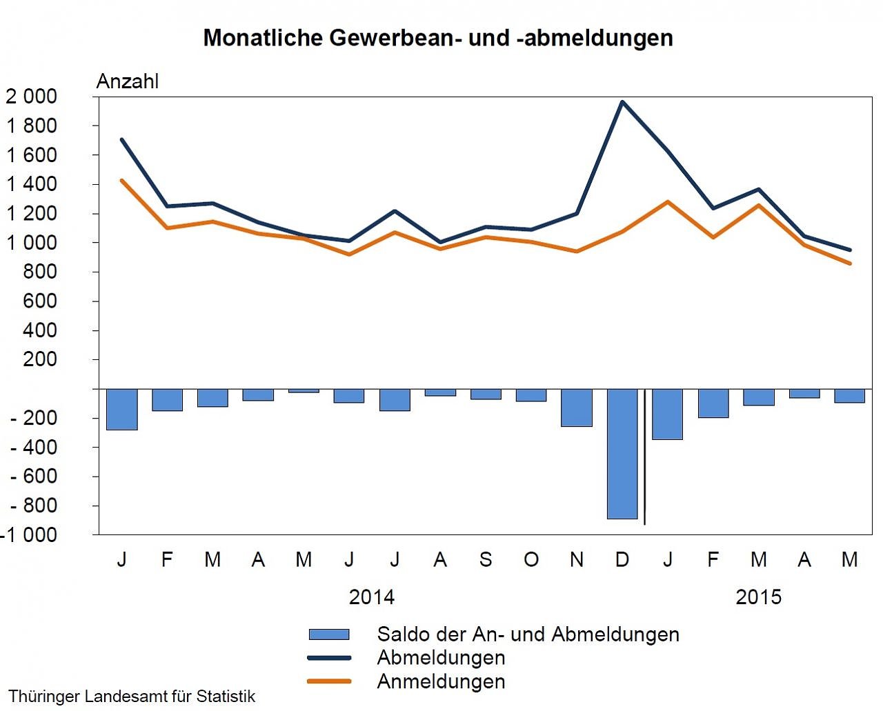 Die Anzahl der Anmeldungen verringerte sich nach Mitteilung des Thüringer Landesamtes für Statistik um 345 bzw. 6,0 Prozent auf 5 415 Anzeigen, die der Gewerbeabmeldungen um 192 bzw. 3,0 Prozent auf 6 225 Anzeigen. Auf 100 Anmeldungen kamen 115 Abmeldungen. Im Vergleichszeitraum des Vorjahres waren es 111 Abmeldungen.