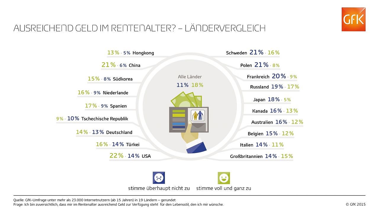 Das zeigen aktuelle Studienergebnisse von GfK. Die Umfrage fand im Sommer 2015 unter mehr als 23.000 Internetnutzern in 19 Ländern statt. Sie gibt Auskunft darüber, wie sehr die Befragten der Aussage zustimmen: Ich bin zuversichtlich, dass ich ausreichend Geld für den Lebensstil haben werde, den ich mir wünsche, wenn ich in Rente gehe.