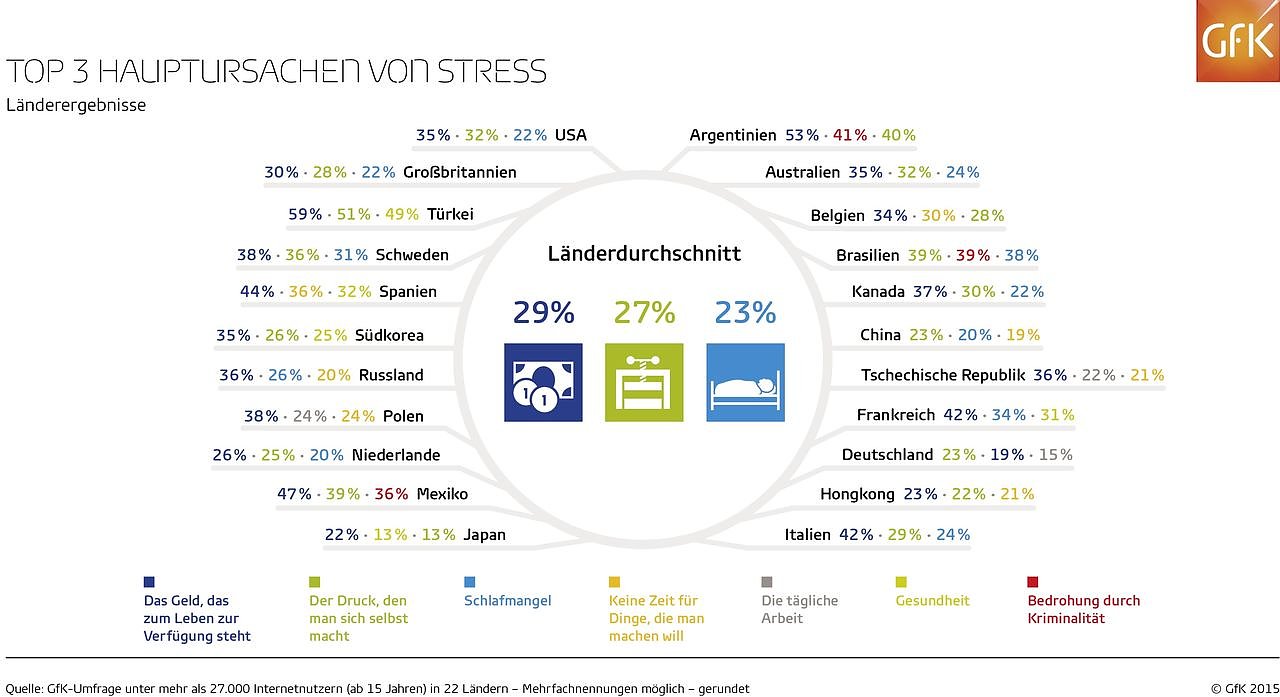 Die Länderdurchschnittswerte zeigen ebenfalls, dass diese fünf Hauptursachen am häufigsten genannt werden – die Reihenfolge weicht hier jedoch leicht vom deutschen Ranking ab: Rund 29 Prozent aller Befragten macht das Geld zu schaffen, das ihnen zur Verfügung steht, gefolgt von 27 Prozent, die sich selbst unter Druck setzen. Schlafmangel landet auf dem dritten Platz (23 Prozent), während die Ursachen, zu wenig Zeit für Dinge zu haben, die man wirklich machen will, und die tägliche Arbeitsleistung von 22 beziehungsweise 19 Prozent genannt werden.