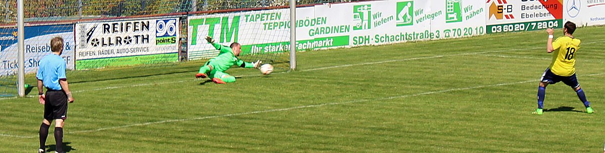 Auch wenn es auf dem Bild so aussah, als ob Mühlhausens Torwart Sören Trappe noch ran käme, aber es reichte nicht mehr, der Ball schlug zum 1:2 in die Maschen eine. Torschütze war Eric Nowak in der 26. Minute durch einen Elfmeter.