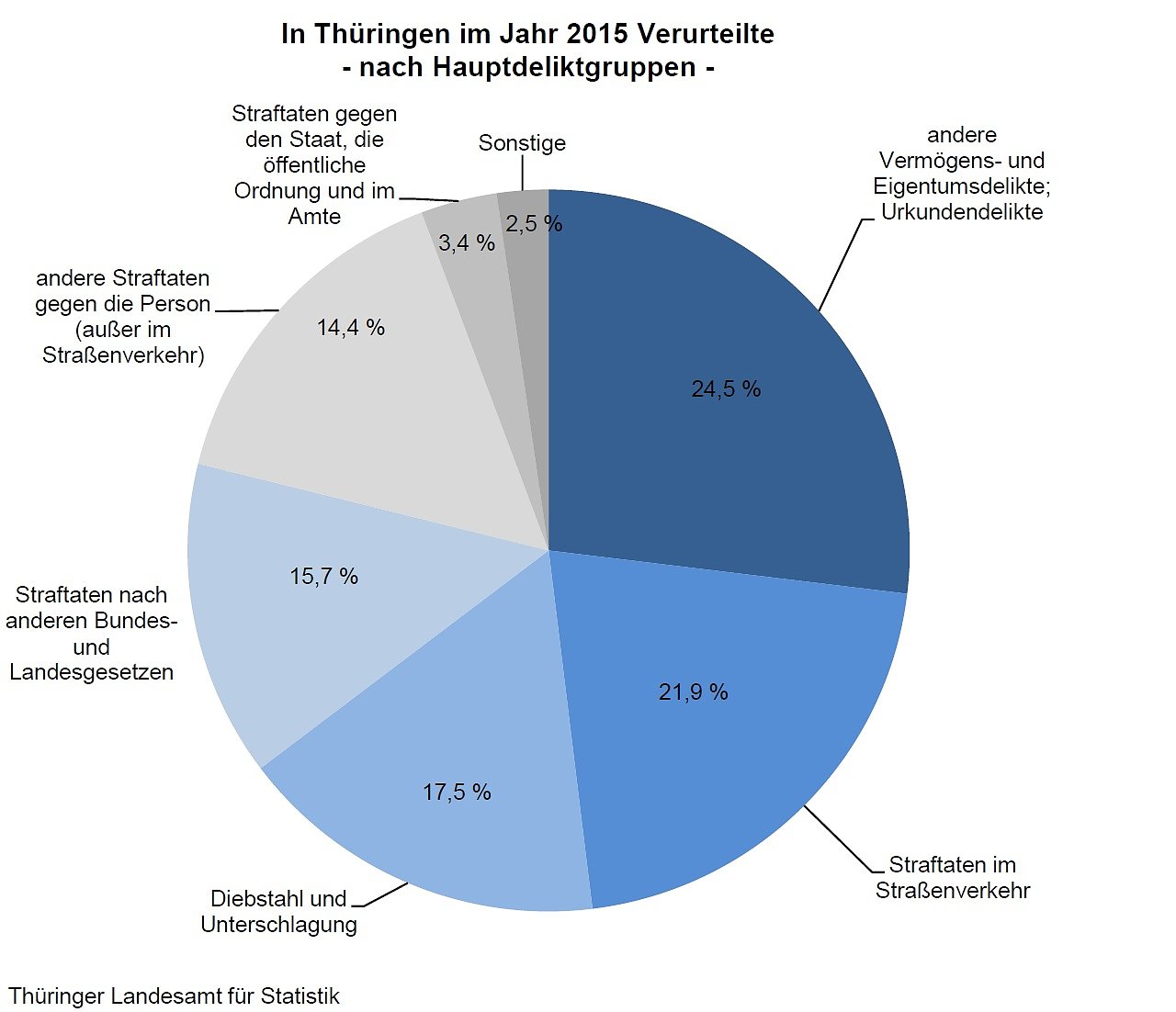 Die meisten Verurteilten (15 816 Personen) hatten gegen das Strafgesetzbuch (- 4,6 Prozent) und 4 226 Personen gegen andere Gesetze (+ 5,8 Prozent) verstoßen. Ein Viertel aller Verurteilten stand wegen der so genannten anderen Vermögens- und Eigentumsdelikte (hier insbesondere Betrug und Erschleichen von Leistungen) und gut ein Fünftel wegen Delikten im Straßenverkehr vor Gericht. Knapp 18 Prozent mussten sich wegen Diebstahls- und Unterschlagungsdelikten verantworten. Mehr als die Hälfte (56 Prozent) aller wegen Straftaten im Straßenverkehr Verurteilten stand zur Tatzeit unter Einfluss von Alkohol oder einem anderen berauschenden Mittel.An den vermehrten Verurteilungen nach den Gesetzen außerhalb des Strafgesetzbuches sind maßgeblich Verurteilungen nach dem Betäubungsmittelgesetz beteiligt. Im Jahr 2015 wurden 2 058 Personen wegen Vergehen gegen das Betäubungsmittelgesetz schuldig gesprochen, knapp neun Prozent mehr als noch ein Jahr zuvor.