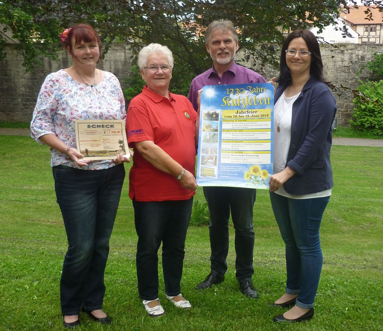Doreen Deutsch vom Kindergarten, Hella Brand von den Landfrauen und Andrea Krausel vom Heimatverein freuen sich auf das Jubiläum und präsentieren stolz den Spendenscheck sowie das Veranstaltungsplakat.