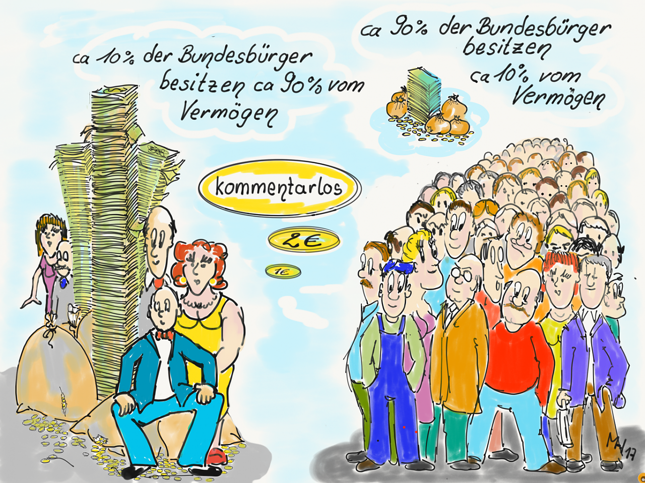 Schaut man auf die Statistik, dann stellt man fest, und denkt für sich, so kann das mit dem sozialen Gleichgewicht aber auch nicht auf Dauer funktionieren. Da besitzen zehn Prozent von den Bürgern der Bundesrepublik neunzig Prozent des Privatvermögens an Geld. Und im Umkehrschluss teilen sich neunzig Prozent der Bürger das restlich verbleibende Vermögen von zehn Prozent...