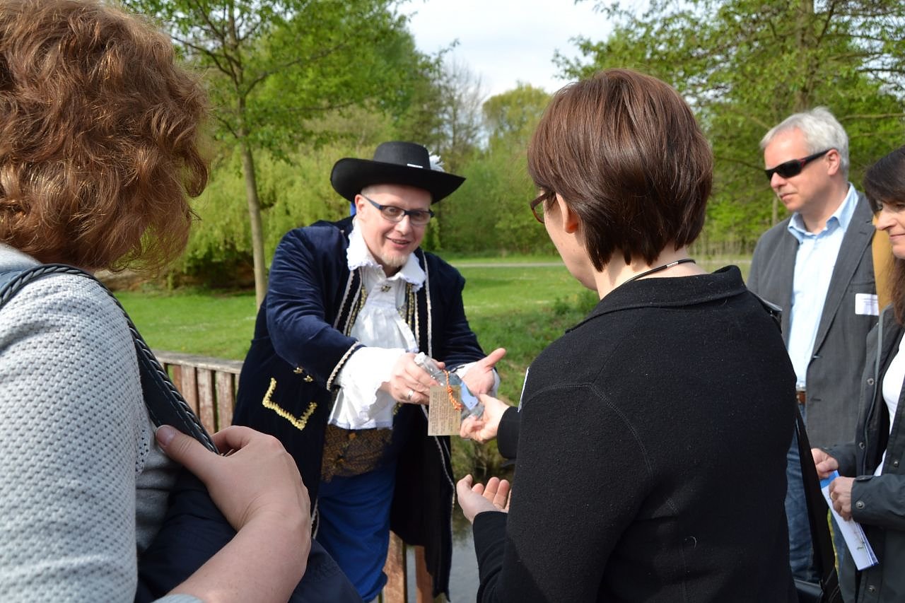 Neben den planerisch-organisatorischen Fakten rund ums das Gartenschau-Konzept erlebten die Kommissions-Mitglieder unterwegs immer wieder überraschende und charmante Begegnungen mit historischen und sagenhaften Persönlichkeiten, so mit dem einstigen Bürgermeister Gregor Fleischhauer, der handgeschöpftes Wasser aus der Popperöder Quelle reichte.