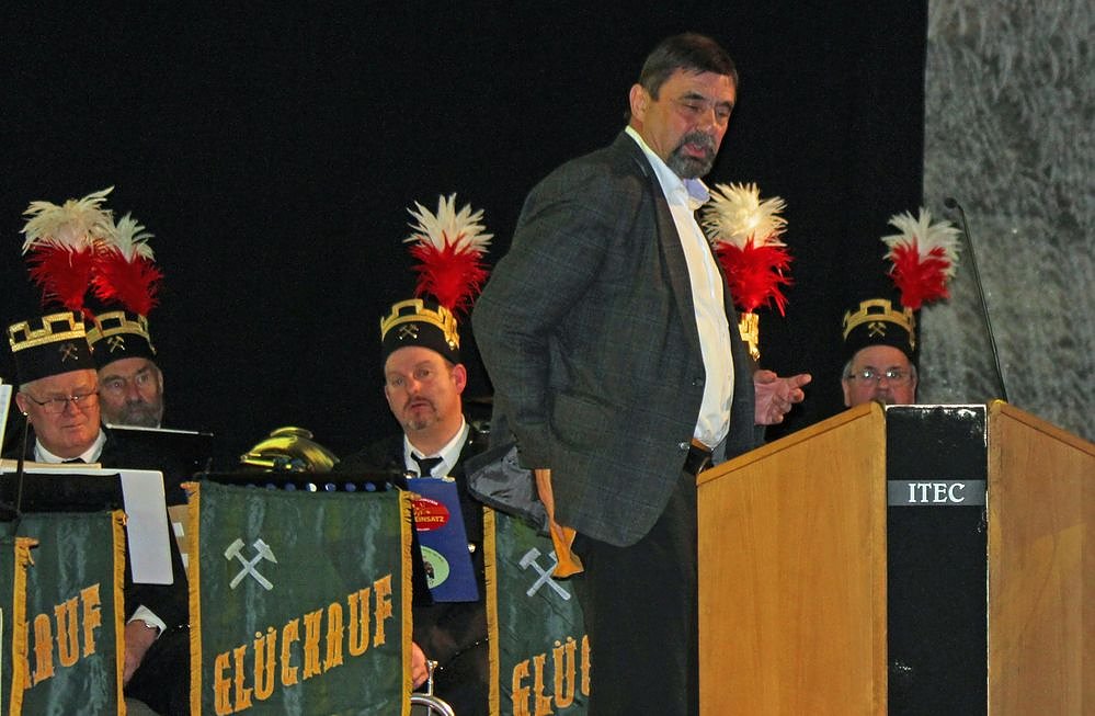 Er verwies auch auf Probleme mit der Altersstruktur. Allein 2017 gibt es 22 Jubilare die 375 Bergbaujahre haben. Er verwies aber auch auf die 59 Einstellungen in den letzten drei Jahren. Bei seinem täglichen Blick auf die Wetter-App hofft er, dass es viel Schnee und Eis gibt, denn das Gewinnen des Streusalzes ist nun mal das Hauptgeschäft. Froh zeigte er sich mit Blick auf die Heilige Barbara, dass man von größeren Unfällen verschont wurde. Der schwerste Unfall war, als sich ein Bergmann mit dem Hammer versehentlich auf die eigenen Finger schlug.