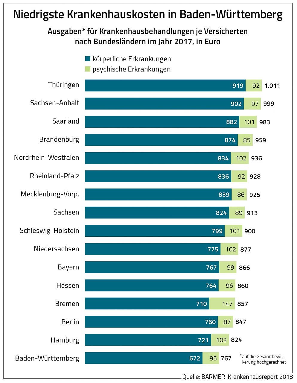 Mehr Fälle bedeuten auch höhere Kosten. Folglich belegt Thüringen auch beim Vergleich der Ausgaben für Krankenhausbehandlungen den Spitzenplatz unter den Ländern. Pro Versichertem sind 2017 im Schnitt 1.011 Euro geflossen. In Sachsen, das eine vergleichbare demografische Struktur hat, waren es mit 913 Euro je Versichertem knapp 100 Euro weniger. Die geringsten Ausgaben sind in Baden-Württemberg mit 767 Euro zu beobachten.