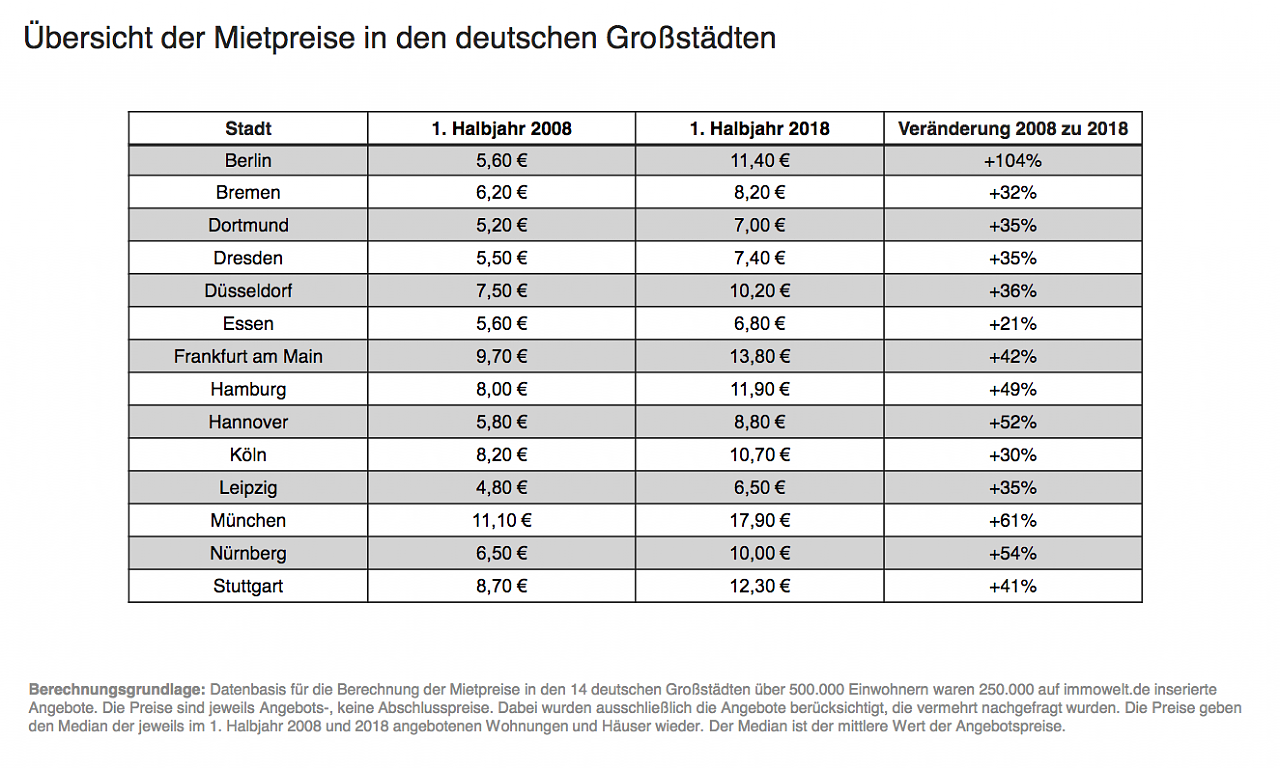 Damit liegt die Hauptstadt bei den absoluten Preisen mit 11,40 Euro pro Quadratmeter im Median inzwischen bundesweit auf Platz 5. Besonders auffällig: Berlin lag 2008 mit 5,60 Euro noch am günstigen Ende der Preisskala gleichauf mit Essen im Ruhrgebiet. Seitdem hat der stetige Zuzug den Mietmarkt der Hauptstadt massiv verteuert.
