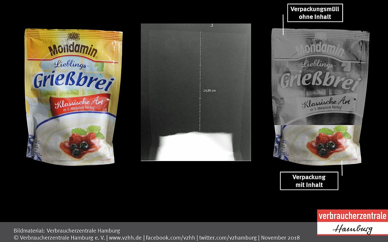 Bei einer stichprobenartigen Untersuchung von 14 Produkten, über die sich Verbraucher beschwert hatten, ermittelten die Hamburger Verbraucherschützer mit Hilfe von Röntgenbildern eine durchschnittliche Höhe von 59 Prozent für den Verpackungsanteil ohne Inhalt. Die Höhe des tatsächlich gefüllten Teils der Verpackung lag im Mittel bei nur 41 Prozent.