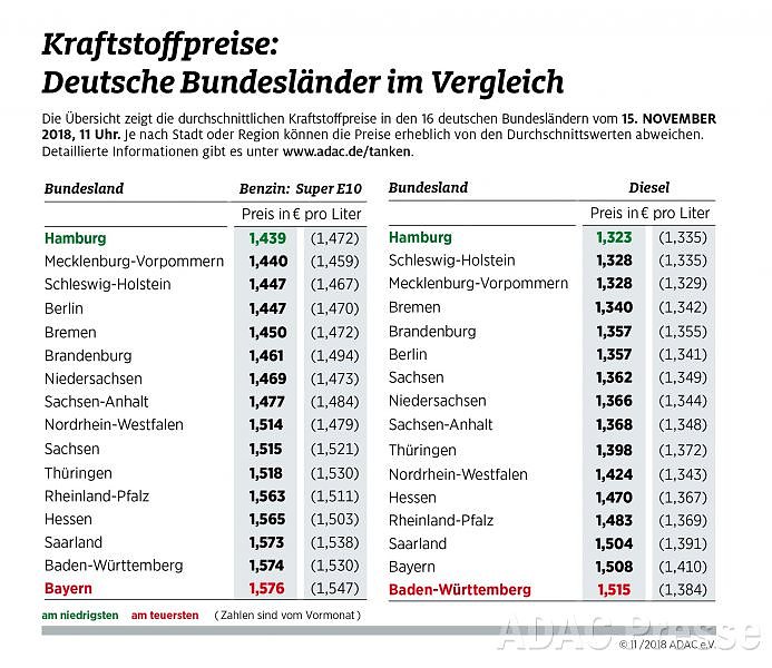 In der aktuellen Untersuchung hat der ADAC am heutigen Dienstag um 11 Uhr die Preisdaten von mehr als 14.000 bei der Markttransparenzstelle erfassten Tankstellen ausgewertet und den Bundesländern zugeordnet. Die ermittelten Preise stellen eine Momentaufnahme dar. Unkomplizierte und schnelle Hilfe für preisbewusste Autofahrer bietet die Smartphone-App ADAC Spritpreise. Ausführliche Informationen rund um den Kraftstoffmarkt gibt es zudem unter www.adac.de/tanken.