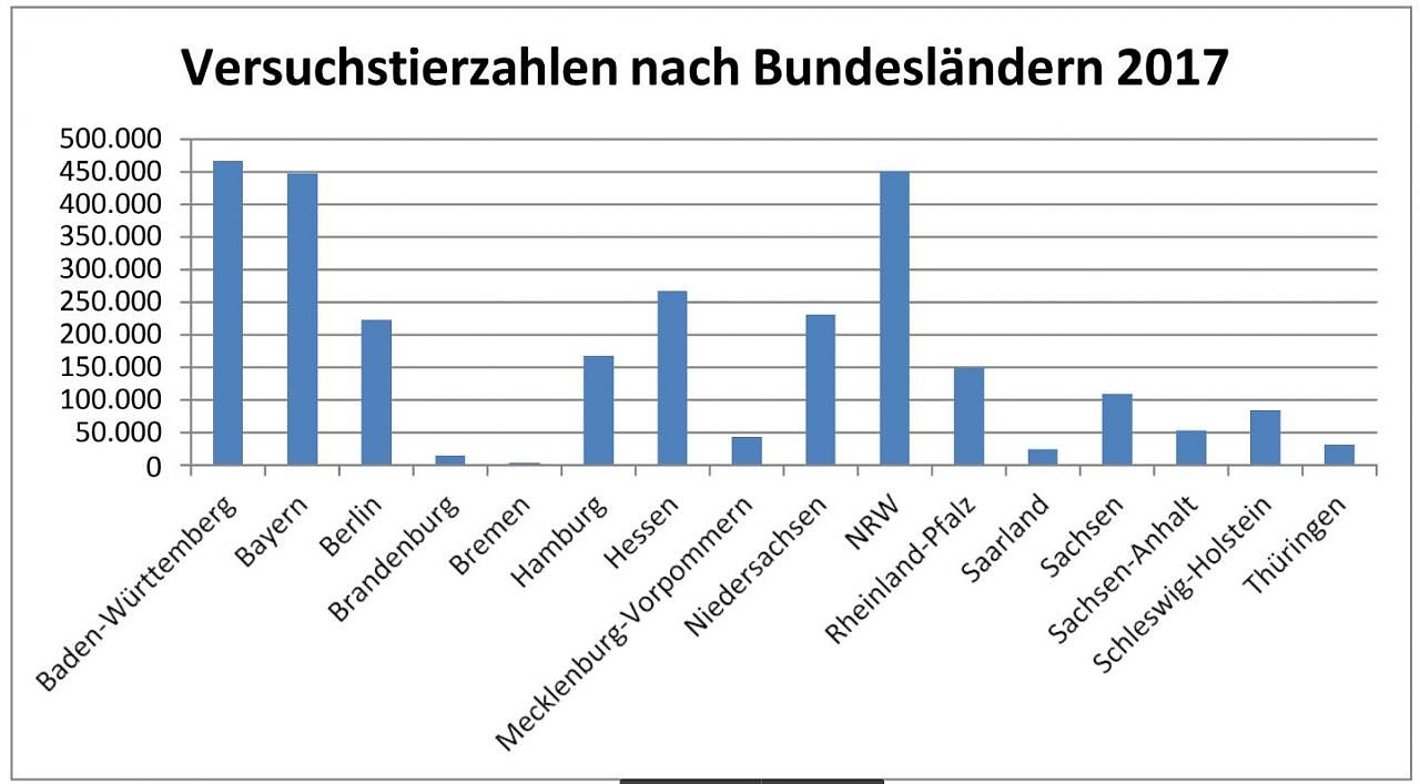 Mit insgesamt 466.595 Tieren ist Baden-Württemberg erneut Spitzenreiter im Verbrauch von Versuchstieren zu wissenschaftlichen Zwecken. Es folgen Nordrhein-Westfalen mit 450.832 und Bayern mit 447.629 Tieren. Fast die Hälfte aller zu wissenschaftlichen Zwecken verwendeten Tiere wird in diesen drei Bundesländern eingesetzt.