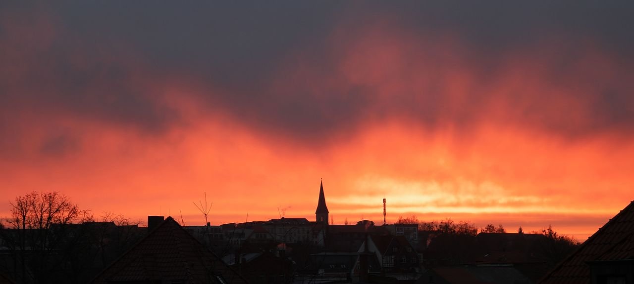Der Himmel begrüßte die Frühaufsteher mit einer geballten Ladung Feuer. Das Foto entstand kurz nach 7.30 Uhr, wenige Minuten später verschwand dann schon der Feuerschein am Firmament.