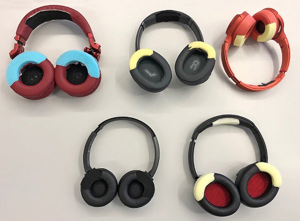 Zerschnittene Kopf­hörer. Für unseren Schad­stoff­test entfernen wir Proben vom Ohrmuschelbe­zug und analysieren sie im Labor. Laien können nicht beur­teilen, ob ein Kopf­hörer krebs­er­regende Stoffe enthält.