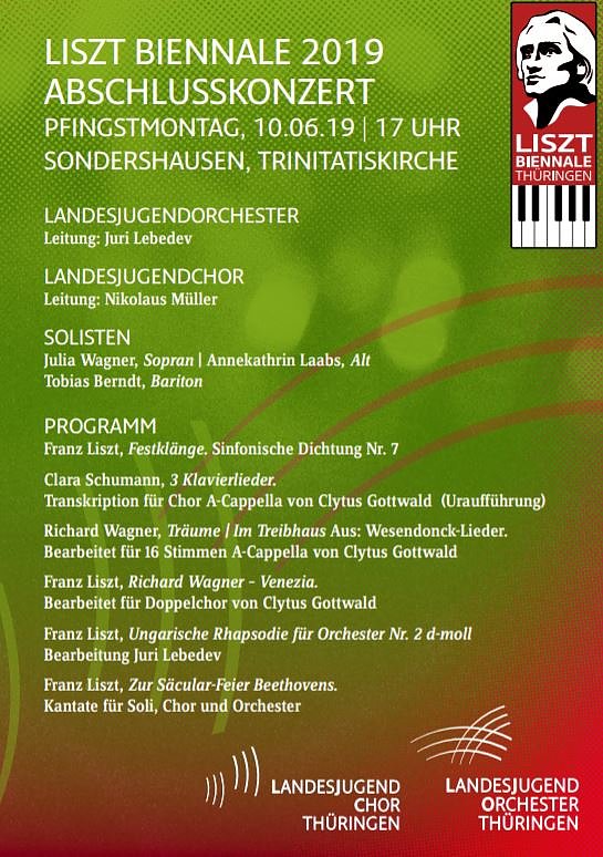Landesjugendensembles – Orchester und Chor – führen am Pfingstmontag, 10. Juni in Sondershausen die 2. Beethoven-Kantate von Franz Liszt in einer Version auf, die seit ihrer Entstehungszeit nicht mehr zu hören war. Desweiteren wird das Publikum die Uraufführung einer neuen Arbeit von Clytus Gottwald erleben.