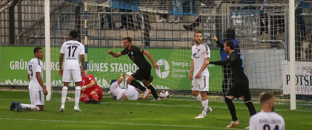 1. Minute: Der Ball rollt in Babelsberg, die Hausherren stoßen an.