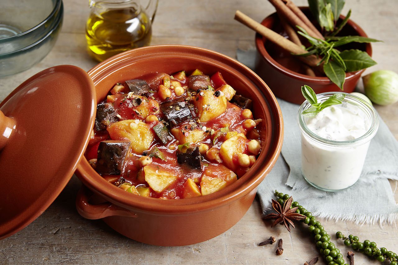 Neben den leckeren Knollen entführen uns Kichererbsen, Auberginen und Joghurtsoße geschmacklich in die farbenprächtige Welt von Tausendundeine Nacht. Original in einer Tajine zubereitet oder in einer feuerfesten Form im Ofen, ist das bunte Herbstgericht leicht gekocht. Hierfür zunächst eine Brühe aus Knoblauch, Zwiebeln, Ingwer, Sojasoße, Zitronensaft, Salz, Pfeffer und der Gewürzmischung Ras el Hanout anrühren. Danach die Brühe, Kartoffeln, Tomaten, Auberginen und gekochte Kichererbsen in die Tajine oder die ofenfeste Form geben und im Backofen schmoren lassen. Zitronenthymian, Zitronensaft, Salz und Pfeffer verfeinern das kräftig-würzige Gericht mit einer säuerlichen Note. Als Topping sorgt Joghurt mit Zitronensaft und Olivenöl für einen frischen Geschmack.