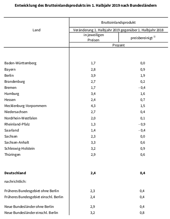 In Deutschland erhöhte sich die Wirtschaftsleistung im 1. Halb- jahr 2019 gegenüber dem 1. Halbjahr 2018 um 0,4 Prozent, im früheren Bundesgebiet (ohne Berlin) und im Gebiet der neuen Bundesländer (ohne Berlin) ebenfalls um jeweils 0,4 Prozent.