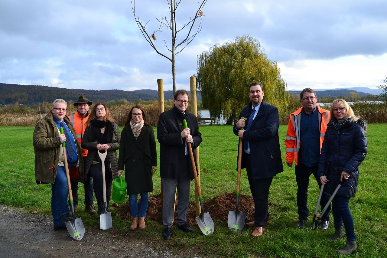 Dazu pflanzten Bürgermeister Alexander Heppe und Oberbürgermeister Dr. Johannes Bruns im Beisein von Guido Knob und Frank Möller vom Mühlhäuser Partnerstädte e.V. gemeinsam zwei Bäume am westlichen Uferweg des Werratalsees in Eschwege.