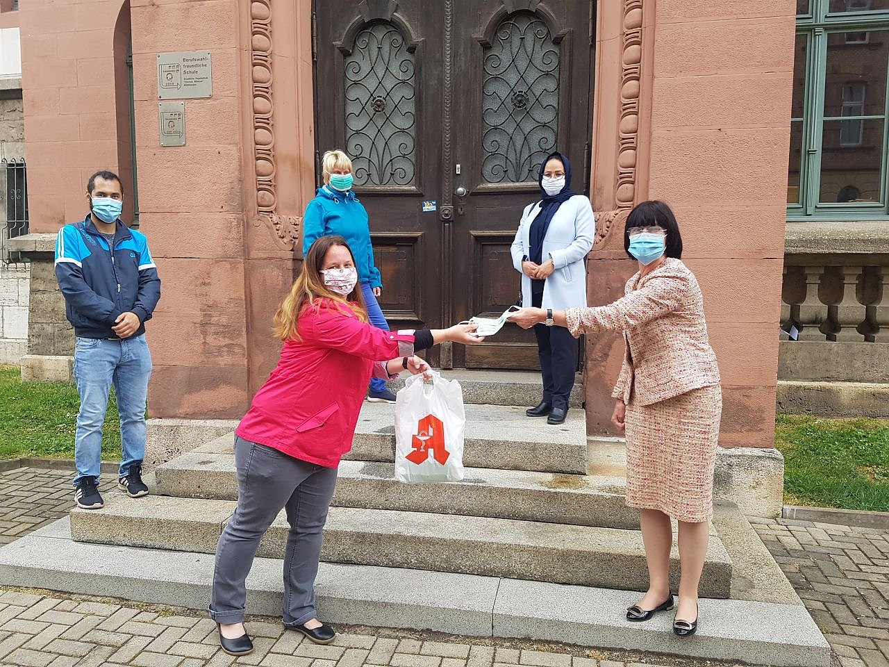Pünktlich vor der ersten Wiedereröffnung der Schulen, übergab Frau Schiller vom Mühlhäuser Stadtteilprojekt der Diakonie Im Kittel, 100 selbstgenähte Masken an die Schulleiterin Frau Lehmann von der Thomas – Müntzer-Schule...