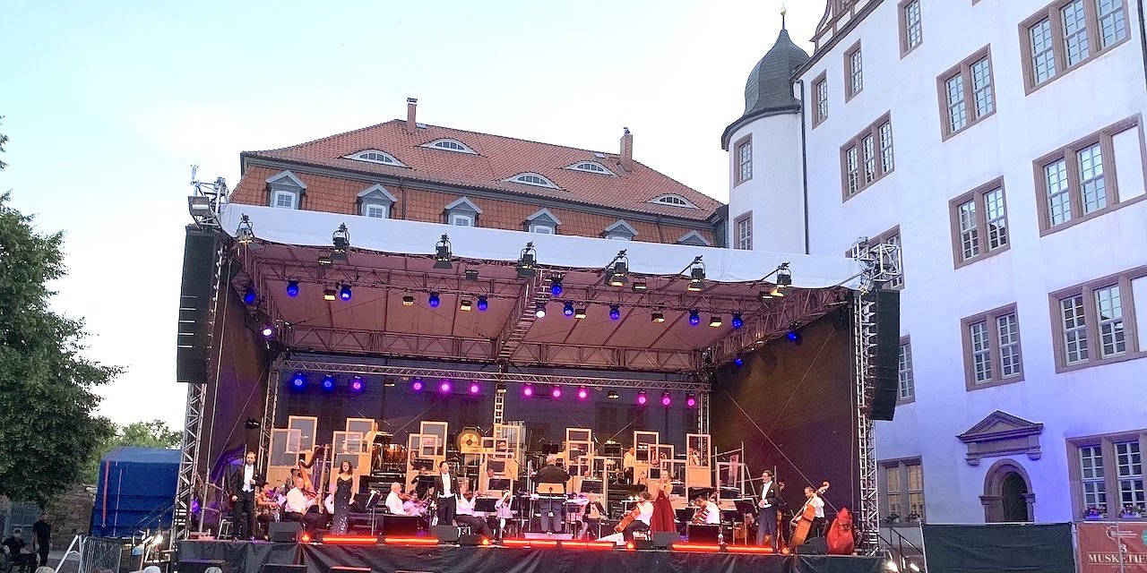 Mit den Solisten Amelie Petrich, Carolin Schumann, Thomas Kohl, Philipp Franke und Kyounghan Seo präsentierte sich am gestrigen Abend das Loh-Orchester Sondershausen auf der Bühne vor dem malerischen Schloss in Heringen. Die Bläser waren durch spezielle Trennwände voneinander und den anderen Kollegen abgegrenzt, auch sonst wurde genauestens auf die Einhaltung aller Corona-Vorschriften geachtet. Diese äußeren Umstände, die auch einen Einmarsch mit Masken auf der Bühne erforderlich machten, wurden jedoch von der Freude der Musiker, endlich wieder auftreten zu können und der Begeisterung der Zuschauer, endlich wieder Livemusik erleben zu können, aufgewogen. Ein gut aufgelegter GMD Michael Helmrath führte gewohnt witzig durchs Programm und besonders die Liebhaber der italienischen und französischen Oper dürften dabei voll auf ihre Kosten gekommen sein. Werke von Rossini, Donizetti, Puccini und Verdi standen im ersten Teil der Gala auf dem Programm, wobei insbesondere die vom koreanischen Tenor Kyounghan Seo vorgetragene Arie Nessun dorma aus Puccinis Turandot zu einem Höhepunkt des Konzerts avancierte.