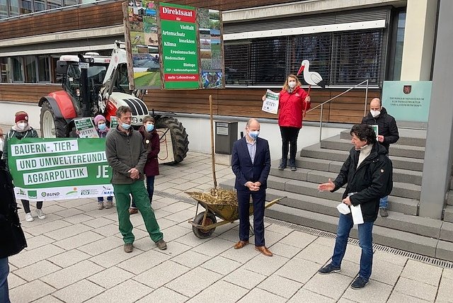 Deshalb hat sich heute ein breites gesellschaftliches Bündnis Thüringer Verbände aus der Landwirtschaft und Naturschutz vor dem Thüringer Landwirtschaftsministerium für eine naturverträgliche Wende in der Europäischen Agrarförderpolitik stark gemacht. Mit Trecker, Mist und Storch übergaben die Arbeitsgemeinschaft bäuerlicher Landwirtschaft (AbL) Mitteldeutschland, der BUND Thüringen, der Bioland Ost-Verein der Gäa-Verein, die Grüne Liga Thüringen, der NABU Thüringen und das Thüringer Ökoherz ihre Forderungen für eine bauern-, tier- und umweltfreundliche Agrarpolitik in Thüringen an Staatssekretär Torsten Weil vom Thüringer Landwirtschaftsministerium.