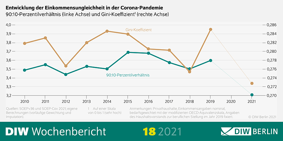 Der Gini-Koeffizient als Standardmaß für die Ungleichheit ist dadurch von 0,29 auf nun 0,27 gesunken. Die sinkende Ungleichheit ist allerdings nur eine Momentaufnahme. Zieht sich die Pandemie noch weit in das Jahr hinein und verschärfen sich die Eindämmungsmaßnahmen noch einmal, könnte dies mit steigenden Insolvenzzahlen und zunehmender Arbeitslosigkeit einhergehen und auch die Einkommenssituation in der Breite treffen, gibt Studienautor Grabka zu bedenken.