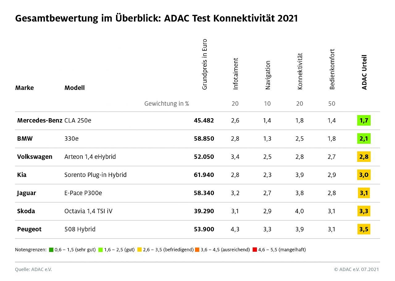 Auf Platz eins landet der Mercedes-Benz CLA 250e Shooting Brake. Er glänzt mit großen, hochaufgelösten Displays inklusive optionalem Head-up-Display, einem großen Funktionsumfang und mehreren Smartphone-Apps. In der Basisausstattung ist er sogar das zweitgünstigste Fahrzeug im Testumfeld. Platz 2 belegt mit dem BMW 330e eine weitere Premiummarke. Punkten kann der BMW mit der spurgenauen Positionierung auf der Autobahn sowie einer Satellitendarstellung bei der Navigationskarte. Der Volkswagen Arteon schneidet mit der Gesamtnote befriedigend ab.