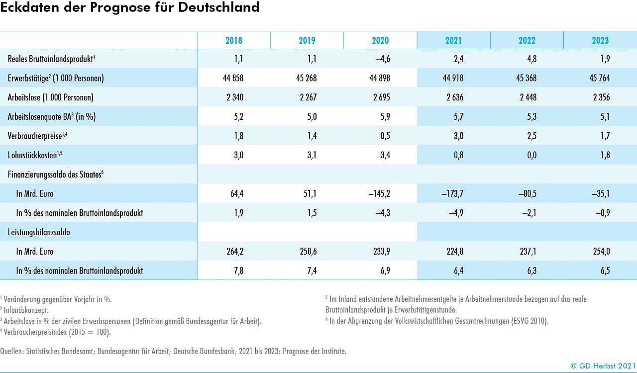 Im Verlauf des Jahres 2022 dürfte die deutsche Wirtschaft wieder die Normalaus­lastung erreichen. Gemäß Prognose der Institute steigt das Brutto­inlandsprodukt im Jahr 2021 um 2,4% und wird im Jahr 2022 um 4,8% zulegen.