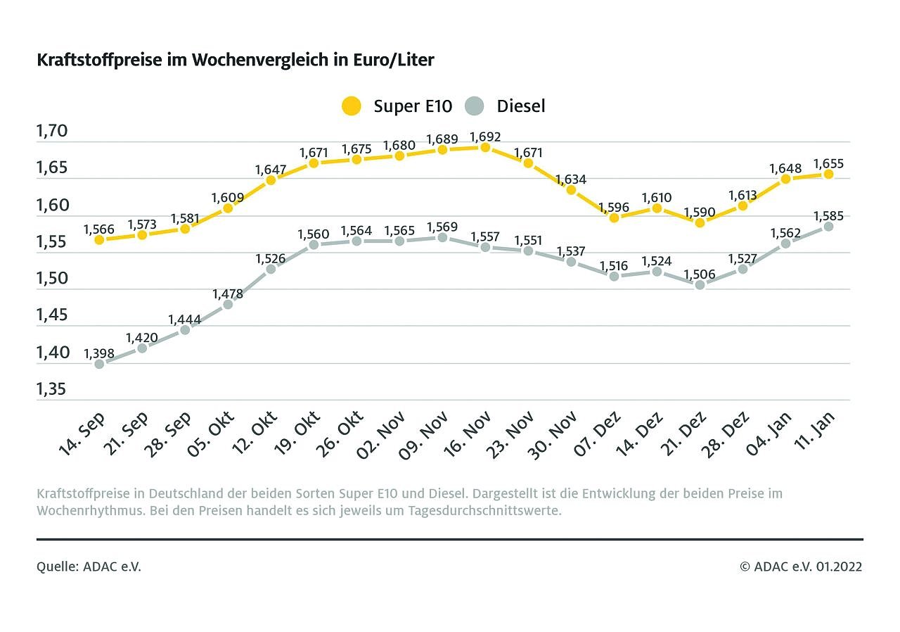Gleichzeitig blieb der Dieselpreis damit nur um 0,1 Cent unter dem Allzeithoch vom vergangenen Montag: Am 10. Januar 2022 kostete der Kraftstoff mit 1,586 Euro so viel wie nie zuvor.