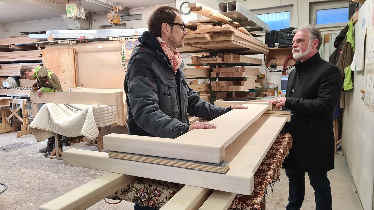 Seine Werkstatt hat Grube selbst auf seinem heimischen Hof in Urbach errichtet. Hier beginnt auch der Besuch des Landrats und der Regionalmanagerin: Insgesamt elf Angestellte, darunter zwei Auszubildende, beschäftigt Grube in seiner Manufaktur. Alle stammen sie aus den umliegenden Dörfern oder sogar aus Urbach. So ein kurzer Arbeitsweg ist doch beneidenswert, findet auch Regionalmanagerin Rebecca Vangangelt.